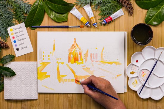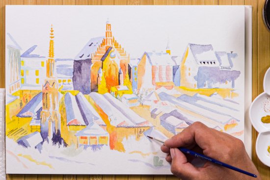 Ebben a hírben lépésről-lépésre bemutatjuk, hogyan készíthetünk karácsonyi hangulatú képet vízfestékkel Nürnberg városáról. Nürnberg a hangulatos karácsonyi vásáráról és történelmi óvárosáról ismert. Az elkészített kép akár a házilag készített karácsonyi üdvözlőlapokhoz is tökéletes lehet.
