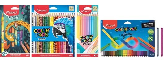 A legkisebbeknek a 12 élénk színben elérhető „Jungle Fever” színesceruza-készletet ajánljuk, amely vidám mintájával biztosan minden apró művész szívébe belopja magát. Az állatok nyelvén értők a „Color`Peps Animal” 24 elbűvölő színével, míg a pasztell árnyalatok szerelmesei a „Color`Peps Pastel” lágy színeivel kelthetik életre a papírt. A határtalan színezés nem kerüli el azokat, akik az „Infinity” készletekre teszik le a voksukat, hiszen kialakításuknak köszönhetően színezés közben hegyeződnek, így akár 10-szer tovább tartanak hagyományos társaiknál.